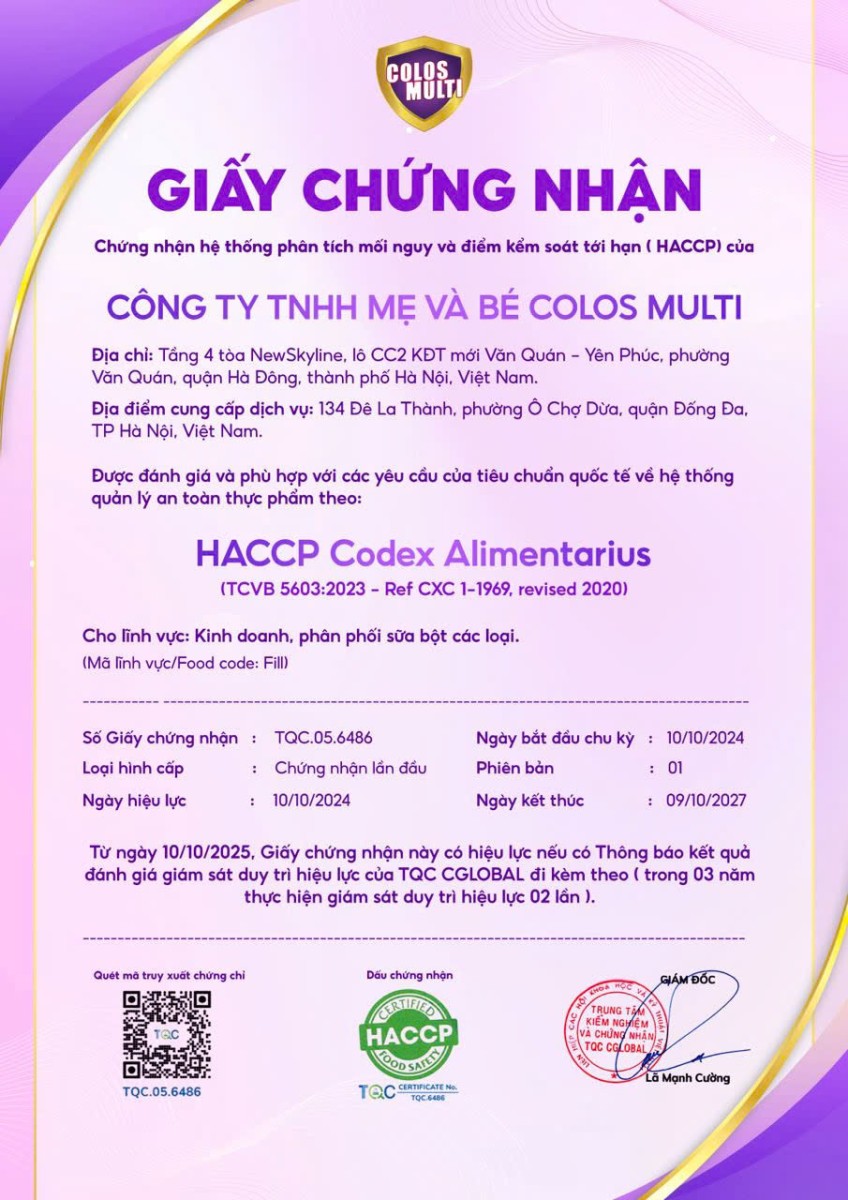 Việc đạt chứng nhận HACCP không chỉ là dấu ấn về chất lượng mà còn là cam kết của Colos Multi đối với sức khỏe của các bé yêu, bảo vệ người tiêu dùng bằng những sản phẩm an toàn và chất lượng cao nhất.